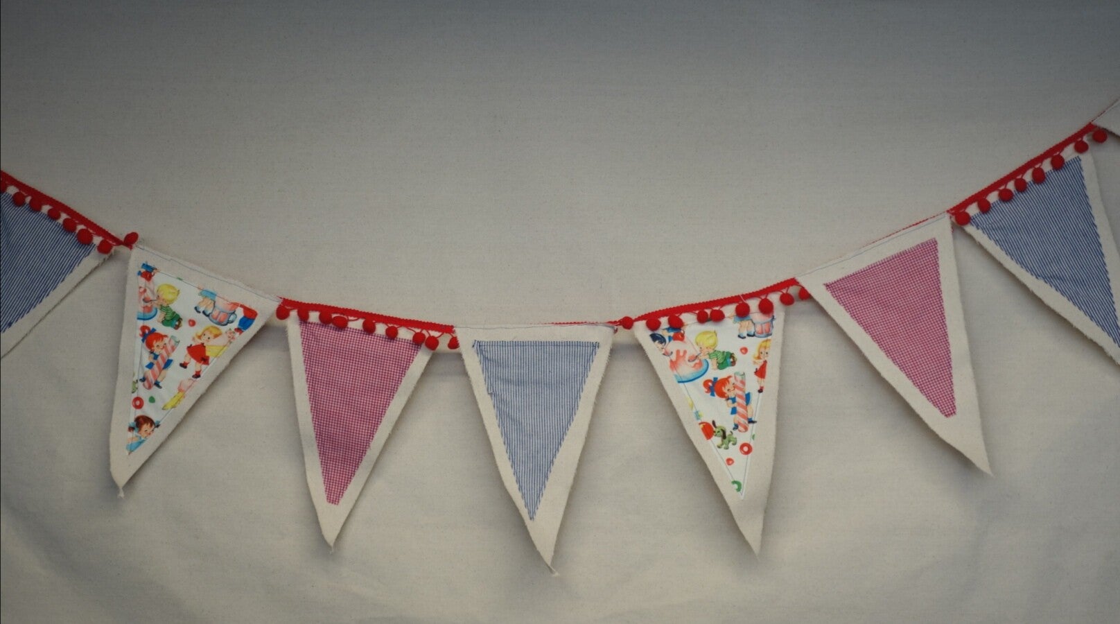 Fabriqué dans notre atelier à partir de tissus recyclés et d'un joli cordon de pompons. Réversible. 8' de long. (12 fanions)