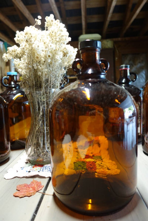 Bouteilles ambrées. Il y en a deux de pareils, mais une avec sa poignée matin en plastique. Servez- vous en pour votre déco.