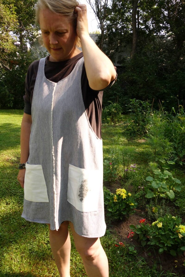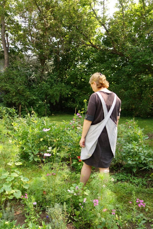Tablier léger, avec bretelles croisées au niveau du dos. Une couture au centre. Deux poches, dont une avec une impression qui a été gravée à l'atelier.