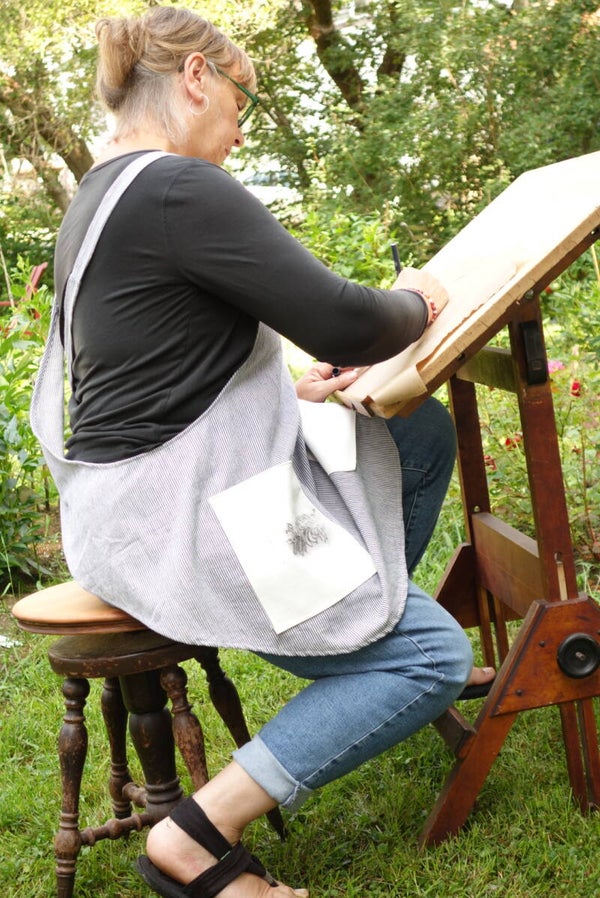 Tablier en coton avec bretelles croisées au dos. Deux poches. Une avec impression fait avec de l'encre pour tissus. Celle-ci a été gravée à l'atelier.
