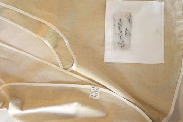 Tablier de coton avec deux poches. L'une d'entre elle à une impression fait avec de l'encre pour le tissus. La gravure a été fait ici en atelier.