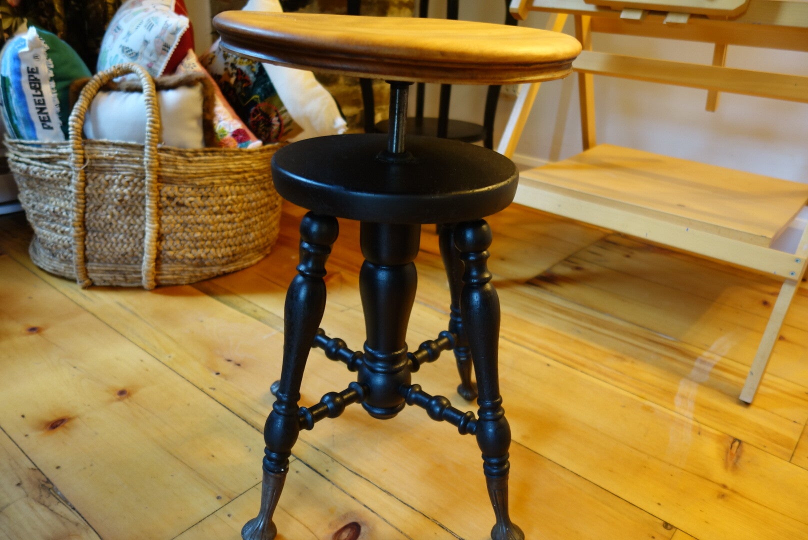 Banc de piano restauré. Le dessus est en merisier et une couche de cire d'abeille à été appliqué comme finition. Ce banc est ajustable. Au plus bas il mesure 40 cm de haut et au plus haut 60 cm.